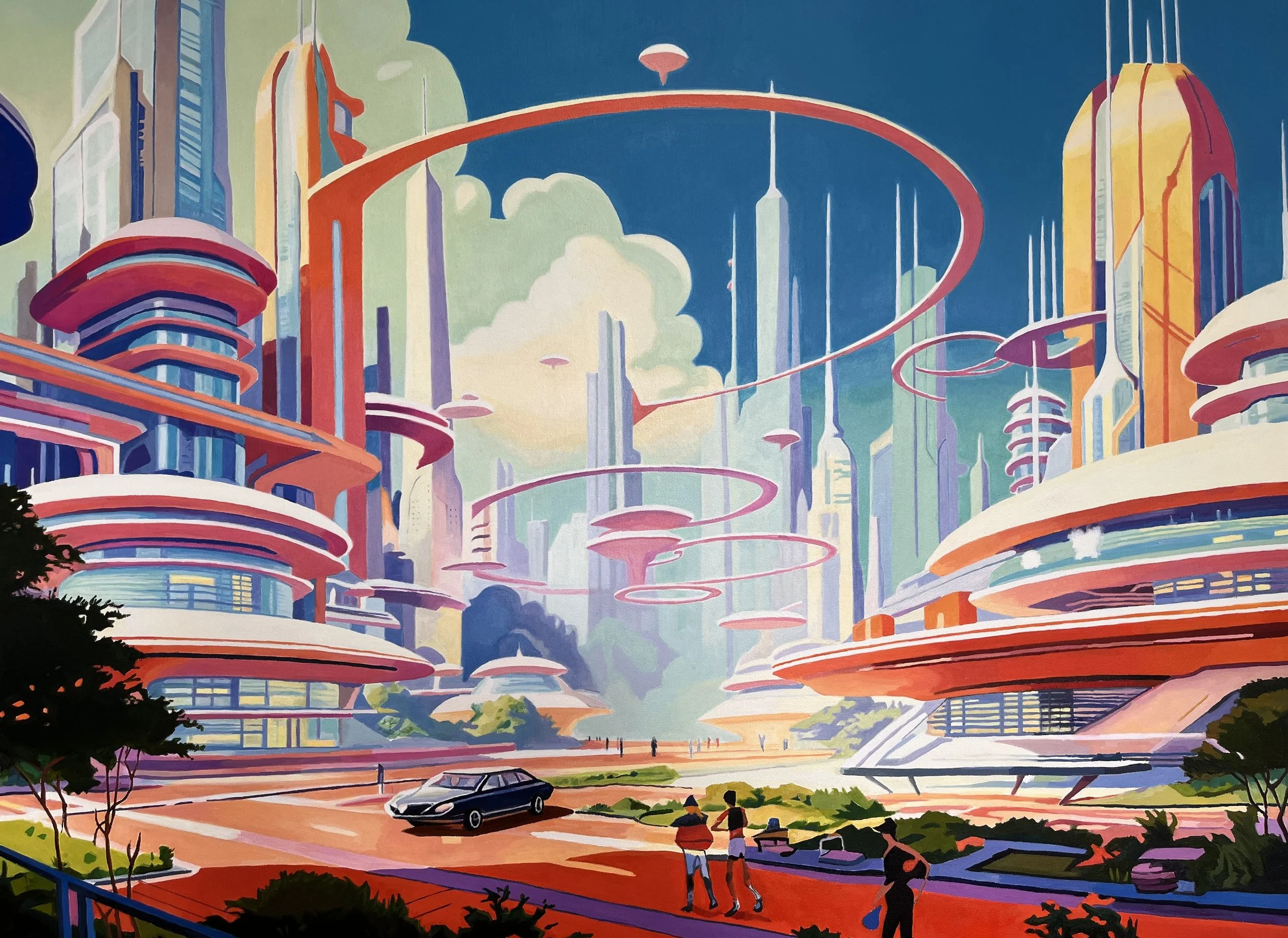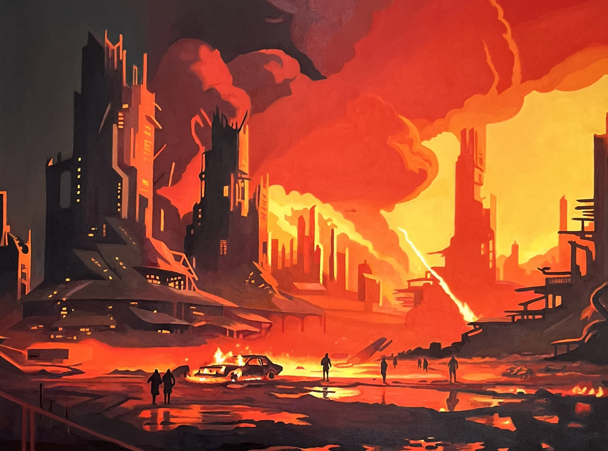 Brooker’s first solo show in New Zealand, Artificial Intelligence, was held at The Refinery Artspace, Nelson, in December 2025. In these recent works, Tom used A.I. programs to help create a series of paintings exploring both the positive and negative impacts of A.I. in the present and near future.